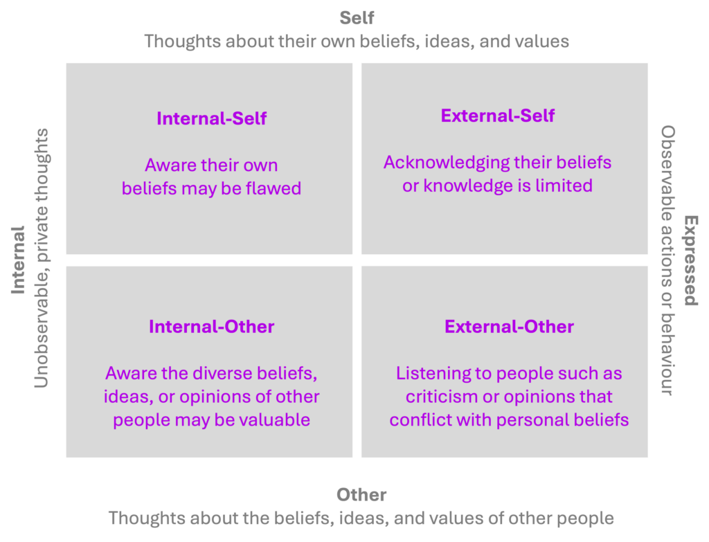Porter, Baldwin, et al. (2022) designed a matrix that delineates four cardinal features of intellectual humility. In this matrix, presented in the following figure,